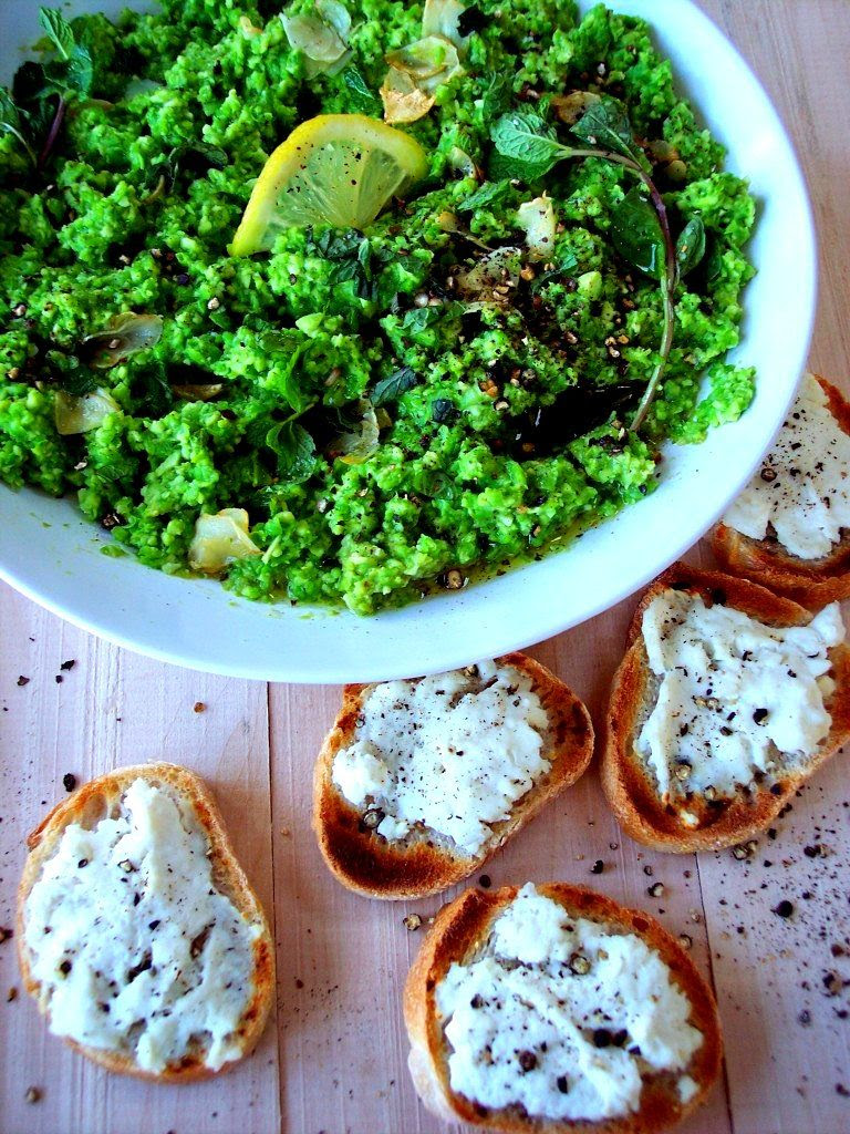 2. In a small skillet with olive oil, add garlic and cook till tender. Stir into pureed peas along with the lemon, pepper, salt and mint.